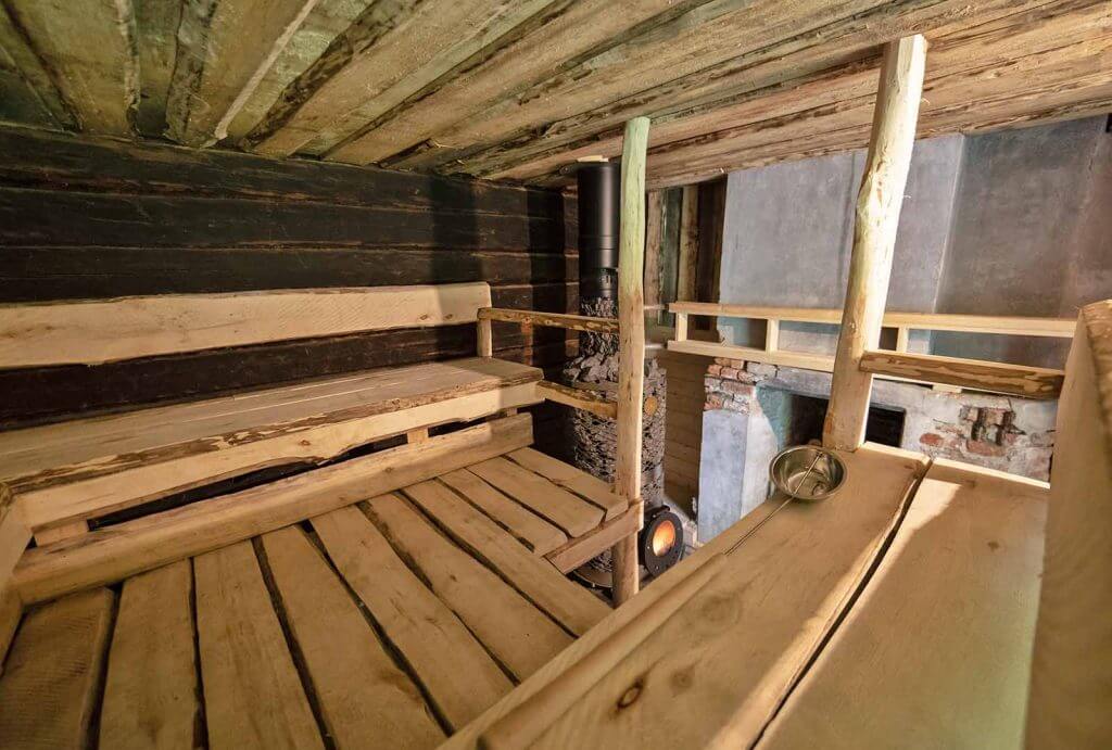Astuessasi tämän historiallisen pihapiirin saunaan hyppäät aikamatkalle 1800-luvulle. Suuri hirsiseinäinen sauna lämpiää puilla. Lauteet ovat haapaa ja puusepäntyönä käsin paikoillaan veistetyt.